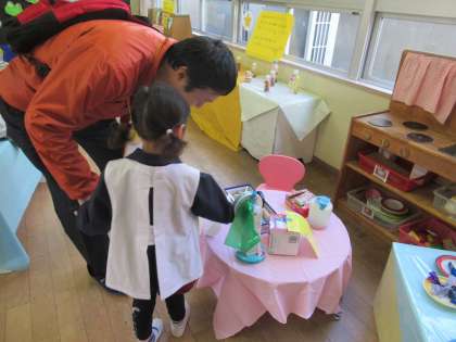 子どもたちがかいたりつくったりして遊んできたものを、今日はお家の方に見ていただきました。