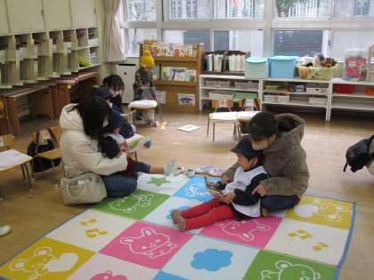子どもたちは、保護者の方と一緒に絵本を見ることも、もちろん楽しんでいましたが、何よりも保護者の方と密着して触れ合えるこの時間を、とても楽しんでいました。