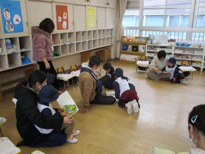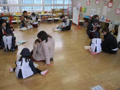 保護者の方も、お家では忙しくてなかなかゆっくり絵本を見ることができなくても、幼稚園でこういう時間をもつことで、ゆっくり触れ合いながら絵本に親しんだり、我が子の新しい一面に気づいたりして、ほっこりとした時間を楽しんでくださっていました。
