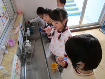 2階でお弁当を食べるのが初めてのひよこ組さんに、一緒に歯磨きをしに連れて行ってくれるそら組、はな組のお兄さん、お姉さんを発見!!