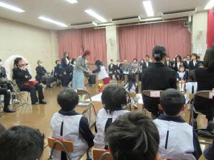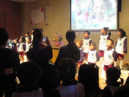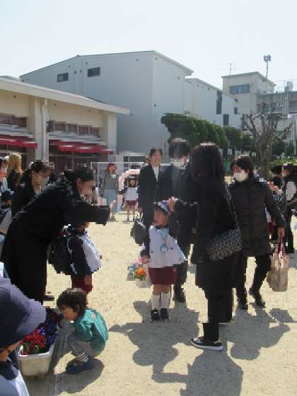 3歳児ひよこ組、4歳児はな組も式に参加し、お祝いの言葉と歌を届けてくれました。式の後には、園庭で園児と保護者、教職員で花道を作って、お祝いしました。