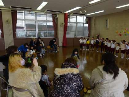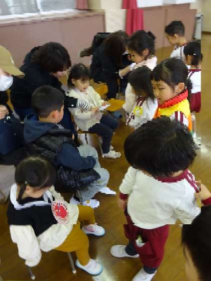 広い園庭で遊んだ後は遊戯室で歌を聞いてもらったり、おうちの人と子どもたちで一緒に歌ったりしました。最後ははな組とひよこ組の子どもたちが心を込めて作ったプレゼント(折り紙で作ったウサギのココアちゃんペンダント)を渡しました。
