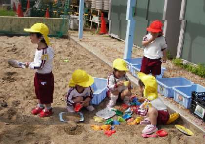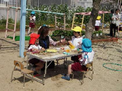 お家の人と離れるのが寂しくて、泣いていた子どもたちも、園庭で砂場で大きな山を作ったり、築山を登ったり、花びらのごちそうや、ダンゴムシ探しなどそら組、はな組のお兄さんお姉さんと一緒に遊んでいると、笑顔がいっぱいになりました。。