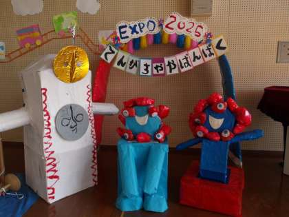今年は関西万博がありました。そこで、天下茶屋幼稚園でも『天下茶屋万博』をしました!ミャクミャクと太陽の塔は子どもたちみんなでつくりました!
