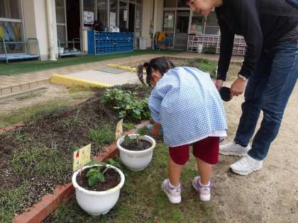 おうちの人と「いちごすき〜」「こ〜んなにい〜ぱいいちごできるかなぁ」と、話しながら苗植えを楽しんでいました。