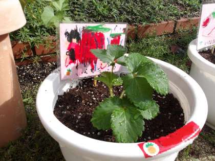 鉢にふかふかの土をたっぷり入れ、穴を掘り、その中に、そぉっとイチゴの苗を置いて、またふかふかの土のお布団をかけてあげてました。