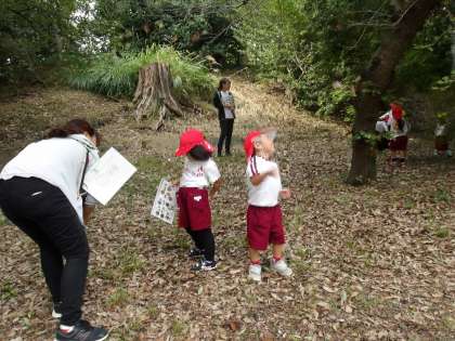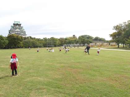西の丸庭園に着くとひよこ組(3歳児)とはな組(4歳児)は、広い芝生の広場でかけっこをしたり、「フワフワやなぁ」と草の感触を楽しみながら寝転がったりして遊びました。林の中ではドングリやきれいな葉っぱを見つけたりもしました。