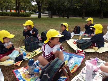 その後は、全園児でおいしいおにぎりを食べてまた、西の丸庭園で遊びました。