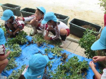 落花生を収穫しました 公開日 2025/10/24 更新日 2025/10/24 幼稚園日記 10月24日(金) 今日はそら組(5歳児)が、落花生の収穫をしました。 今年はたくさん実り、引き抜くのもひと苦労。みんなで力を合わせたり、ひとりで力いっぱい引き抜いたりして収穫しました。 収穫した落花生を一つずつ丁寧にとって、『(耳のそばで)カラカラなってる』『こっちはふにゃふにゃや』『(割れた中身を見て)ピンク色や』『土はちょっと濡れてた』と、落花生や土の感触を味わいました。 いいね(0)