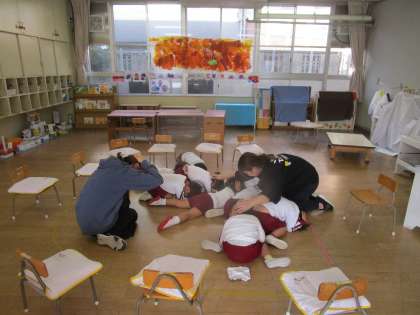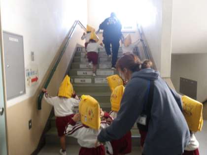 子どもたちは放送を聞き、頭や体を守る体制をとり、その後防災頭巾をかぶり園庭へと避難しました。津波警報の避難指示を聞き、落ち着いて天下茶屋小学校の3階へ避難することができました。