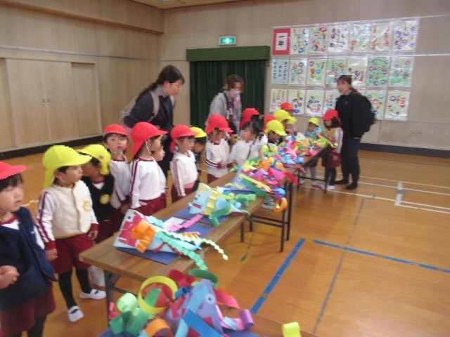 普段からかいたり、つくったりして遊び、またこども展覧会も経験している子どもたちは、小学校の作品展を見に行くことを知ると、「何つくってるんやろ?」「どんなんあるやろな!」とワクワク楽しみな様子でした。